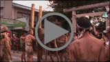 神輿や隠居神輿を八枝神社のお仮屋(神楽殿)から担ぎ出すことを「お山出し」といい、この時祭典が行われる。お山出しの祭典を前に、若衆頭より挨拶と新担ぎ手の紹介、提灯の配布、注意事項の説明が行われ、お浄めの御神酒をいただく。その後、関係者及び来賓は神楽殿前に整列し、お山出しの祭典となる。お山出しの祭典が終了し、挨拶や来賓紹介の後に、花火と若衆頭の合図でお山出しとなり、同時に囃子連の演奏が始まる。神輿と隠居神輿は境内を揉んで歩き、当番は幣束(大幣)を持ち神輿を先導する。神輿、隠居神輿、囃子連のタカウマの順に鳥居を出て、渡御が始まる。なお、お山出しの際の囃子の曲目は「ヤタイ(屋台)」で、移動中の囃子は「ニンバ(ひょっとこ)」や「カマクラ(鎌倉)」などが演奏される。