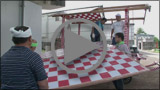 囃子連は、お囃子の演奏は神輿の渡御の際にはタカウマを使用するが、流し踊りや山車の引き回しの際には、屋台を使用する。準備の日には、囃子連が開平橋の下の広場を利用して組み立てる。屋台は牛車を改造したもので、柱や屋根、飾りを取り付ける。 |
