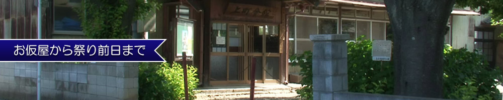 本来、7月7日のお仮屋の日に行われていた祭りの準備は、南・下宿・新田の祭りの1週間前、上宿の祭りの2週間前にあたる日曜日に行っている。祭りの本部は仮設の小屋で、八枝神社の境内、鳥居を入ってすぐの左側に設営する。かつては、八枝神社の北側にある地蔵堂前に設営していた。本部は、祭りの受付や接待に利用され、祭り当日の早朝には、囃子連による朝っぱやしが行われる。本部の隣には、接待小屋が設営される。本部設営と合わせて、神社境内の提灯・電灯の設置を行い、囃子連は翌日のお仮屋の準備をする。 |