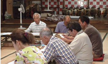 当番の主な仕事で神事に関わるものとしては、3月のフセギや祭り当日の各戸へのお祓いや、どろいんきょをする際の先導役である幣束持ちなどがある。また、当番は、神事に関わる職務のほか、祭りに向けて若衆頭と共に各種準備を行い、実行委員会や祭り願いなどの会合に出席する。 |