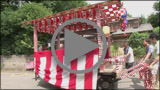 タカウマとは、木枠の一方の側に大太鼓、もう一方に小太鼓を付けたもので、脚部の車で移動しながら囃子の演奏ができるものである。囃子連は、お山出しの前までに、タカウマで囃子を演奏しながら、上宿公民館から八枝神社の境内に移動する。お山出しに合わせて囃子の演奏を再開し、隠居神輿の後を演奏しながら追う。なお、どろいんきょをしている間は、演奏が続けられる。祭り当日、囃子連が上宿公民館でタカウマを組み立てる。 |