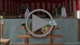 当番が中心になり、隠居神輿の飾り付けをする。縛った縄と神輿の隙間に榊を挿し込んで飾り付け、御神体となる御幣をヤカタに納める。また、この時に大神輿の御幣も納める。 |