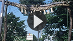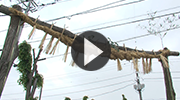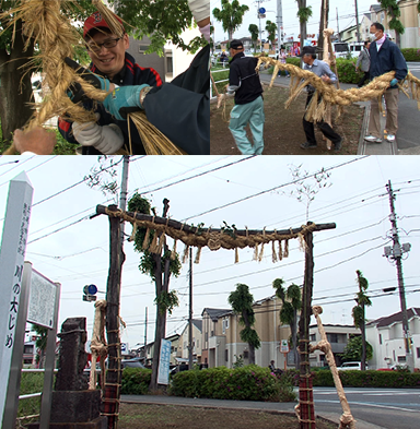 行事の当日、旧川村の鎮守・神明神社で大きなしめ縄をつくり、村の入口の道路に運びます。当時は、旧川村に入る唯一の道路であり、この入口を締め切ることで、村内を守ることができると考えられてきました。また、さらに威力を増すために、しめ縄の中央部には、馬のわらじと呼ばれる大きなわらじを取り付けます。
