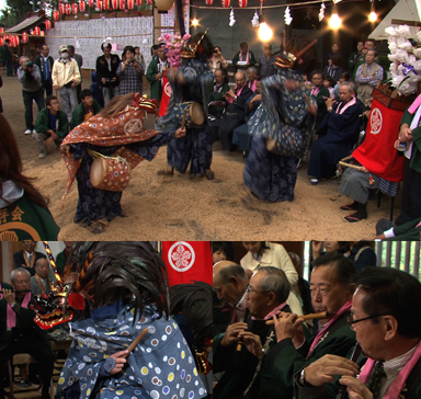獅子は、牝獅子・中獅子・王獅子といい、3人1組で舞います。また、舞場の四方には、花笠と呼ばれる役の子供が配置されます。花笠は、頭に花笠をつけ、手にはササラと呼ばれる摺り簓を持って演奏します。笛は、6孔5本調子の篠笛で、舞全体を進行させます。