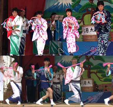 本来は、社寺の祭礼・法要などに奉納する形式で行われるものではなく、農民の娯楽の一環として踊るものです。畔吉では、大正時代にはすでに行われてきたといわれます。現在、畔吉の鎮守・諏訪神社の春祭で万作踊りを奉納していますが、かつては大宮氷川神社の社人であった杉山社中の神楽を上演していたもので、昭和55年から万作踊りを奉納するようになりました。