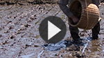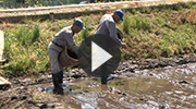 摘田とは、直播による伝統的な稲作の栽培方法です。上尾市の市域を含む北足立台地では、昭和40年代まで摘田による稲作を行ってきました。この地域は、畑作を基本とした農業地帯であり、わずかな田が台地の谷部にある低湿地であるうえ、用排水路の整備も困難であるという地理的制約がありました。摘田による稲作では、播種の際の畝引きの作業や、稲刈りの際のソリ(田舟)の上に稲束を置くなどの特徴的な作業があります。なお、本映像はかつての摘田による稲作の様子を平成21年に再現したものです。
