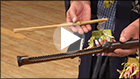 ささらは、篠竹の先を細かく割ったものを「ささら」といい、煤竹で作られた鋸状の「簓子」とセットになります。太鼓を右で叩く場合は、手前に引いて音を出し、左で叩く場合は押して音を出します。 -