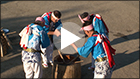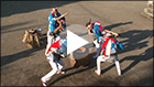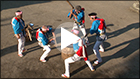 藤波地区の餅つき踊りは、四人一組でつくのが基本となります。演目は、「餅つき」と「曲づき」に大別されます。「餅つき」は比較的軽い杵を使い、実際に餅をつきながら踊るもので、演目は立ちボーウチ、座りボーウチ、餅殺し、一本抜き、七五三、早づき、八人づきがあります。なお、立ちボーウチと座りボーウチは、この地域の麦作の作業歌である麦打ち唄に合わせてつきます。「餅つき」の基本は餅殺しで、一本抜き、七五三、早づき、八人づきはその変形となります。一方、「曲づき」は「餅つき」が終わった後に、さらに細く軽い杵を使って、空の臼の周りで演じるもので「獅子追い」「寝ず」などの演目があり、高度で複雑な動きをする踊りです。
